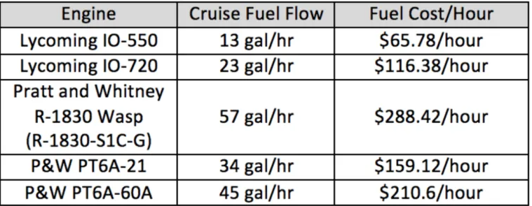 Using a cursory review of the data above, the raw fuel flow values are misleading. The Lycoming engines appear to hold the advantage in terms of pure fuel flow, besting the PT6A-21 by at least 11 gallons per hour.