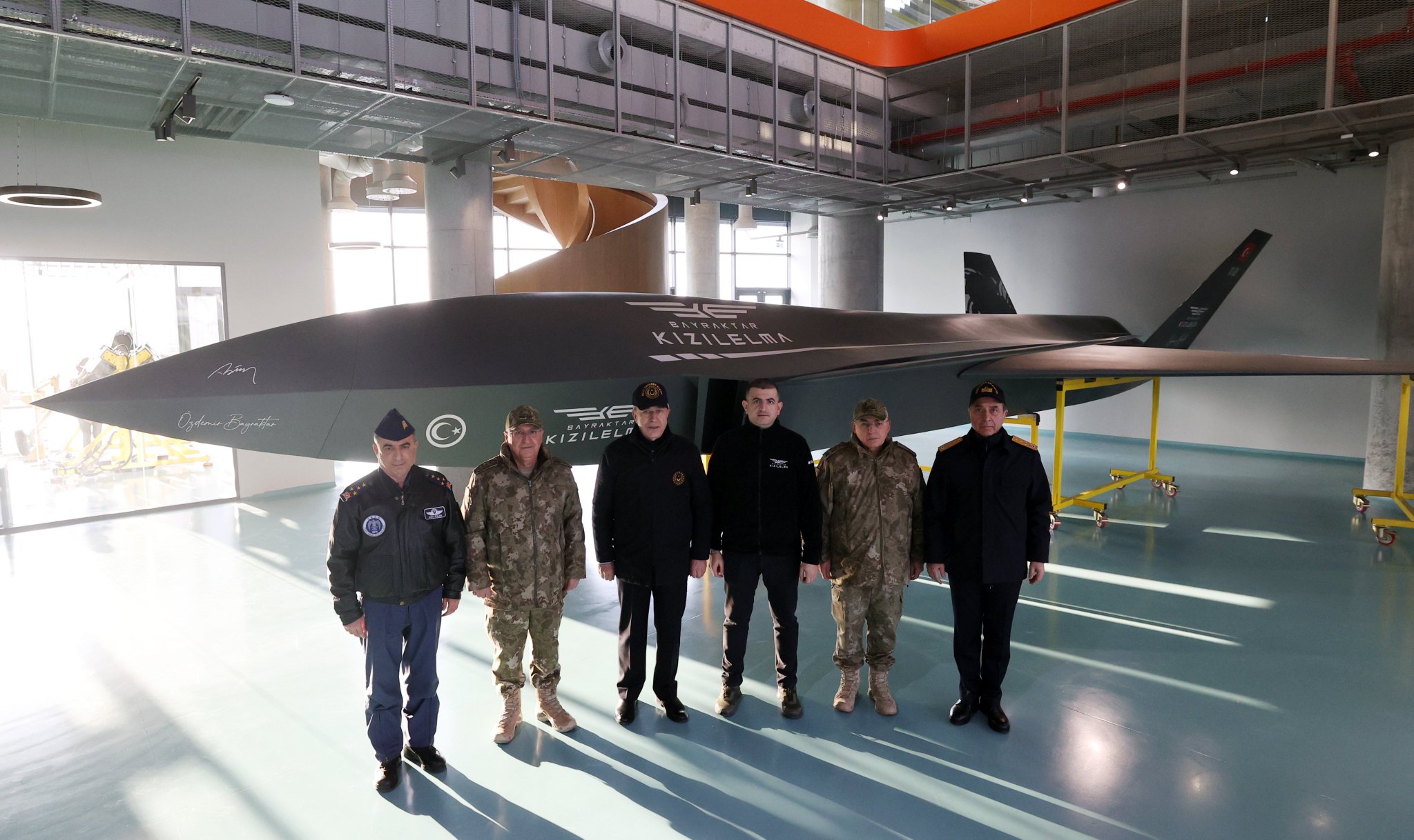 The Turkish Minister of Defense and the Chief of Staff of the Turkish Army inspect the Turkish-made "Kizil Alma" jet warplane, at the headquarters of the manufacturer, "Baykar".