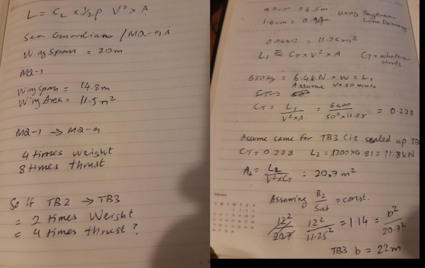 i.e we get about 22 meter wingspan and 21 square metre wing area for TB3...which compares favourably to the dimension increases of MQ-1 to MQ-9 (which have same coefficient similarity if you look at line drawings).