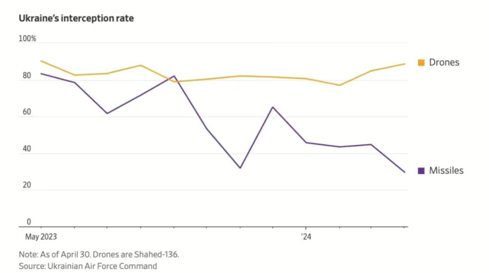 Two huge factors at play there.Successful interception of Russian missile dropped to 46% on average for both drones and missiles