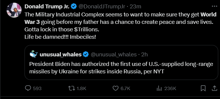 Regarding the permission for Ukraine to use US kit to strike within Russia, I've seen some analysis on that to the effect of the delay was probably intentional on Biden's part to give Russia a chance to get their important shit back further out of range, and that kind of adds up. If that's true, the inside-Russia strikes won't amount to much anyway. In any case it seems Zelensky is finally coming around the the notion of this being the beginning of the end, given the way he's been talking recently. German guy's speaking directly to Putin, I think the gears are moving here. Probably this time 2025 the peace lines will be drawn, more-or-less where they stand today.