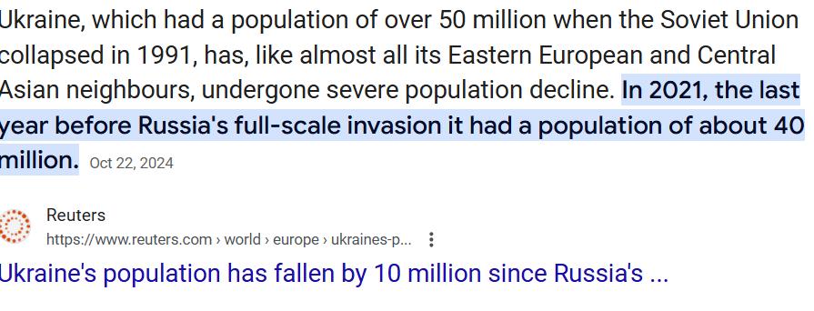 Also have no idea where you're getting a laughable/ridiculous number like 25 million from. The entirely of the Russian military's somewhere north of 2 and likely under 3, and they've not yet mobilized much of that. Like at all. If Russia were drafting every able-bodied Ivan, they'd be ravaging Ukraine right now. With much less guys than 2 mil. They don't need to do that , as slow as the progress may be with a volunteer army + suicidal criminals, it's progress all the same and Ukraine's now feeling the boot on its throat. What, you think Biden & Co are just telling Zelensky to force last-year's highschool graduates to the front-line for shits & giggles? They're getting majorly desperate.