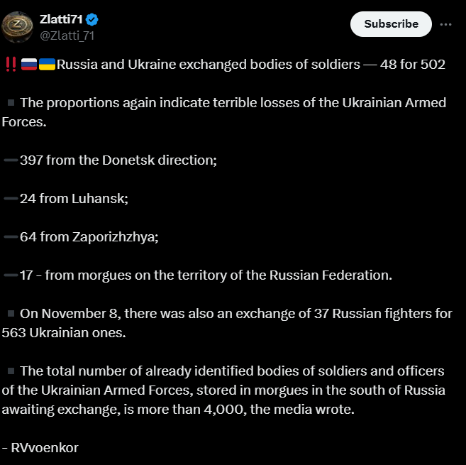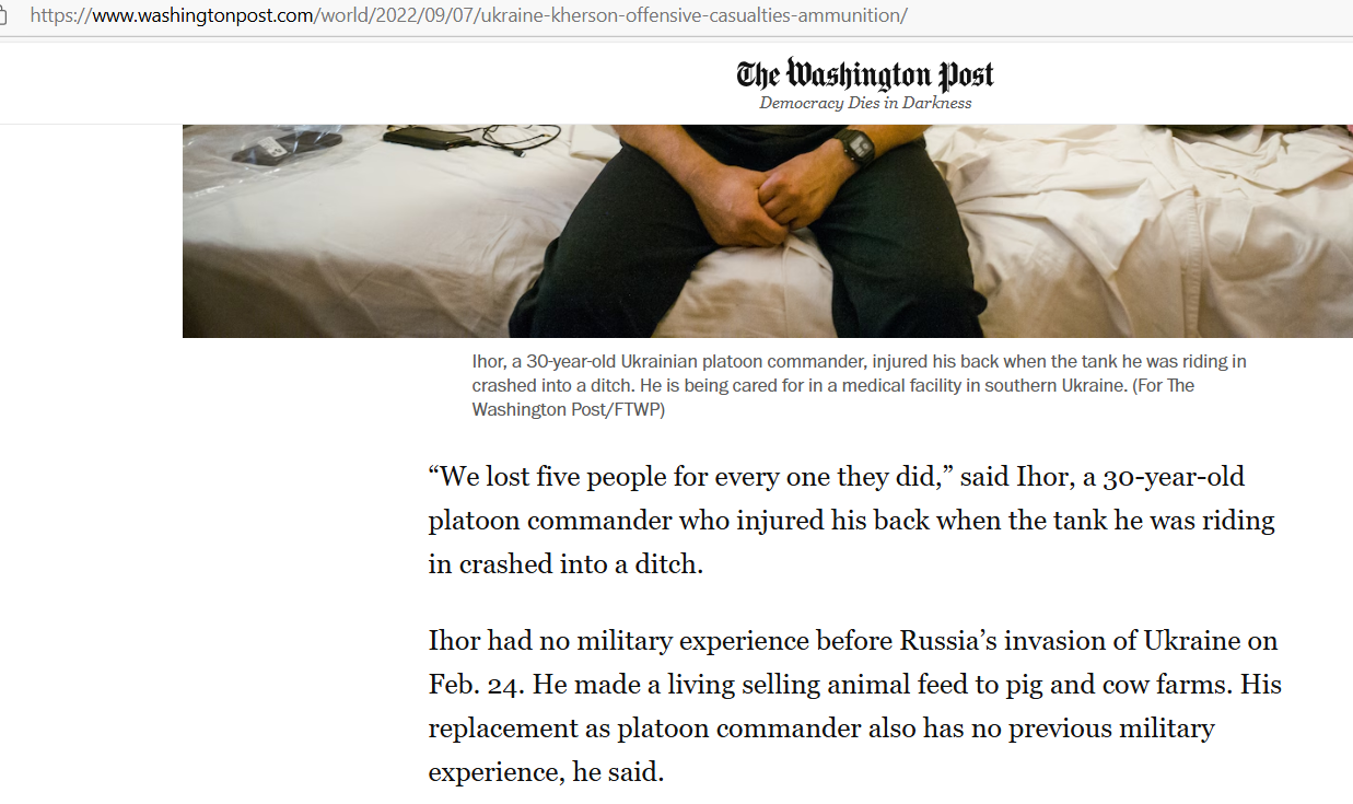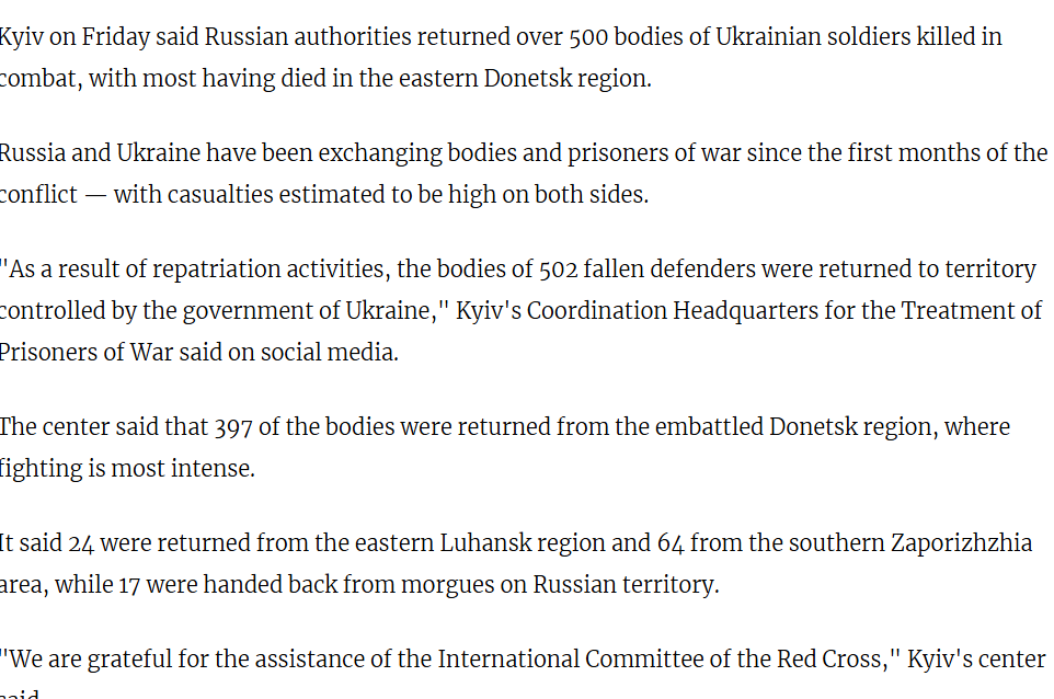 That's the prudent point then, isn't it? It doesn't really matter how many Russians are meeting their maker when it's a comparable/similar amount for Ukraine in the same theaters. That's still Russia achieving more in the same engagements, as each dead Ukrainian doesn't have some other poor soul willing & able to take his place. Conversely, plenty more Russians where they came from, they're not even close to being anywhere near full mobilization, whereas Ukraine's pretty much using everything & everyone they've got.