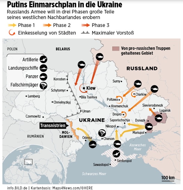 In the first phase, southern Ukraine will be captured, "to secure supplies to Crimea and also to cut off Ukraine from the sea and therefore from supplies," a security officer told BILD.