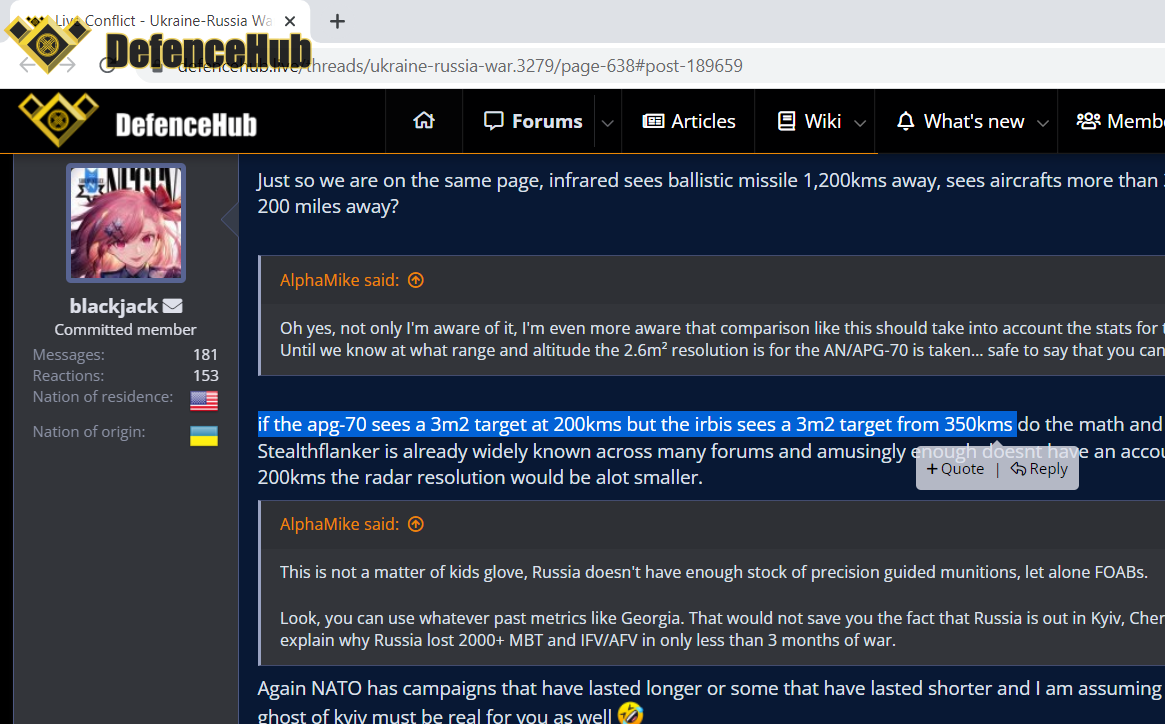 hehe, first of all we're talking about SAR capabilities, not air-air tracking capabilities LOL. in which the IRBIS reportedly able to give a resolution of around 3m at a range we don't know and the APG-70 also with a resolution of around 2.6m also at a range we don't know.View topic - AN/APG-77 detection range • F-16.net