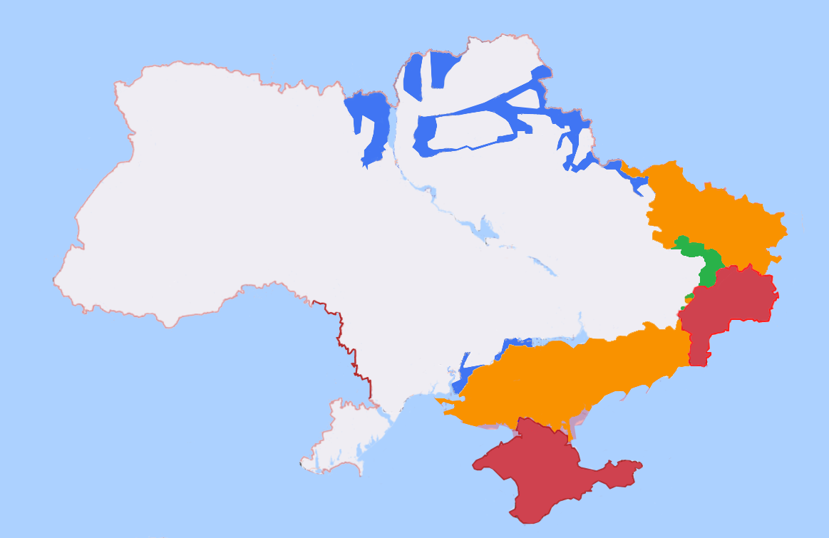 1) Prior the 2022 war Russia controlled 7.4% of Ukraine territory (red color).