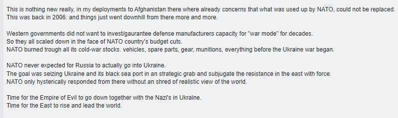In fact, if the Sierra army depot is a military on its own it would be top 4 in the world, so I don't understand where he got the idea that NATO already burned all its stocks for Ukraine, the Abrams haven't even arrived yet. :confused: