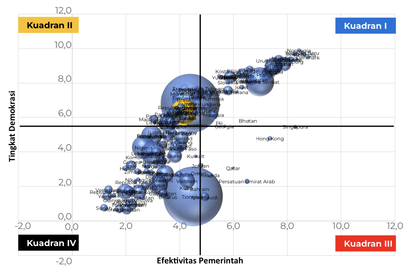 Indonesia in quadrant II, wrote there usually this is the place for democracies and middle power with higher demographic density (population density), same with Brazil, India and Argentine. Different with Canada and Australia is population density(?)