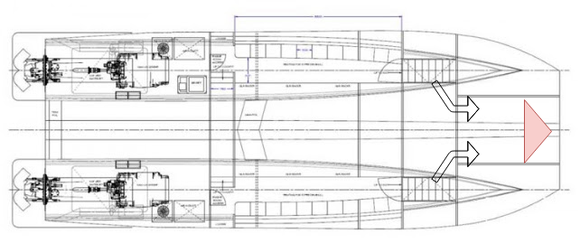 propeller not really a concern in this case (since the boat using waterjet with enclosed nozzle anyway) , was once thinking like anmdt said , but too much moving part on that section could become a 2 sided blade and if somethings wrong happened (door or ramp on the inner bow hull can't be closed) it can risk the hull to get flooded , perhaps why not all the frontal section between two hull can be lowered down and then extended at a comfortable angle , atleast make the disembarkation process more convenience for the soldier .