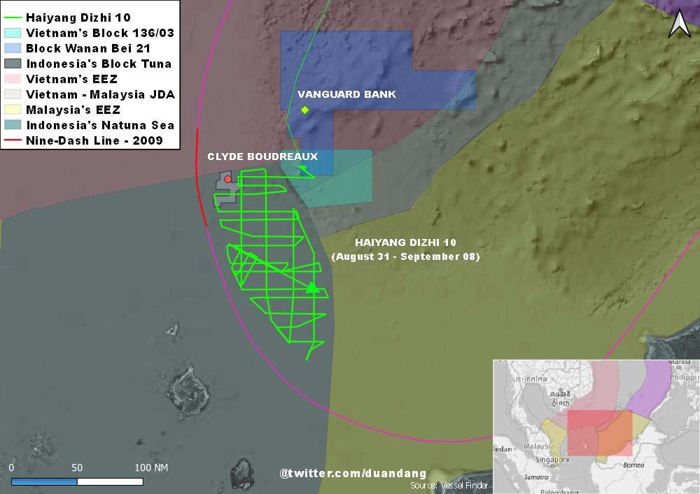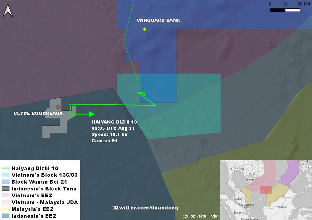 On August 31, China sent survey vessel Haiyang Dizhi 10 to the area. Ship-tracking data showed that it sailed into Tuna Block and approached Clyde Boudreaux at a distance of less than ten nautical miles.