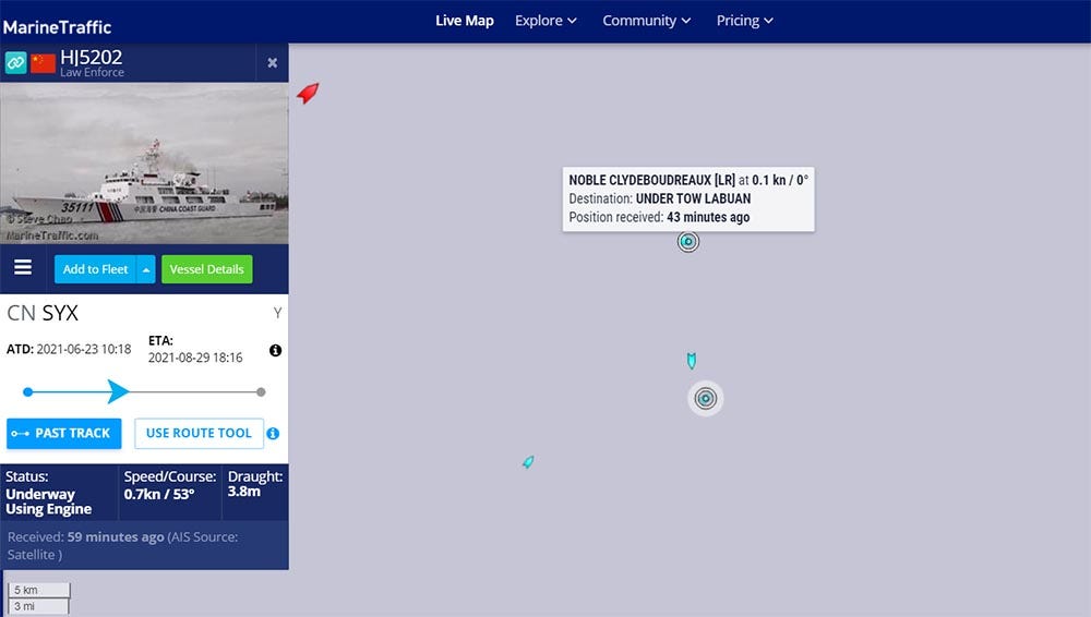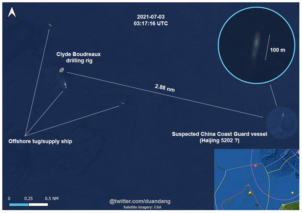 On July 18, CCG 5202 turned on the AIS signal, confirming its presence near the drilling rig.