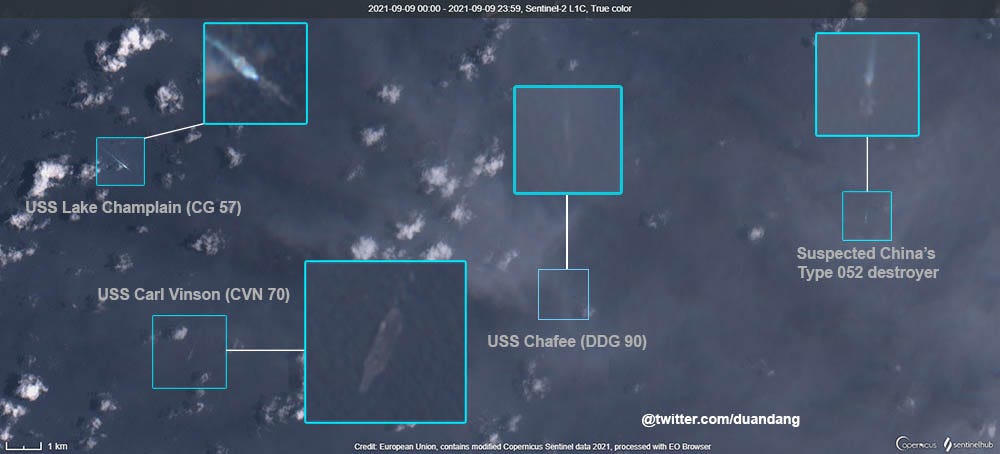 After entering the South China Sea on September 5, U.S. Carl Vinson Carrier Strike Group was spotted operating in the southwestern part of the sea on September 9. A Type 052 or 052D destroyer was spotted shadowing the carrier strike group.