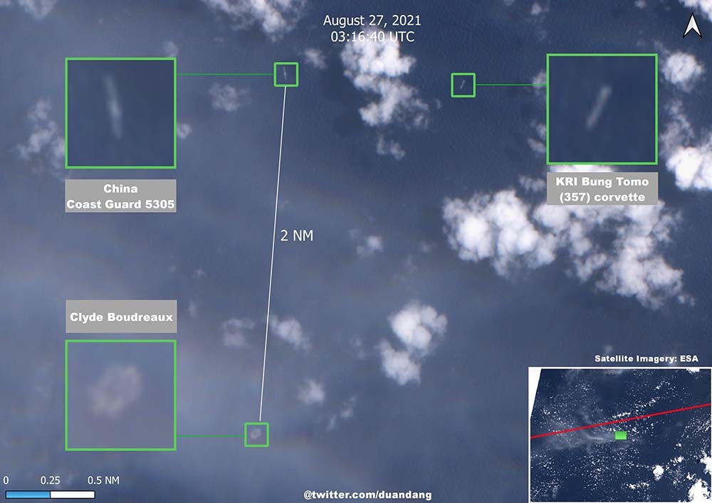 On August 27, CCG 5305 was seen about two nautical miles from Clyde Boudreaux. It was closely monitored by TNI-AL’s KRI Bung Tomo (357) corvette.