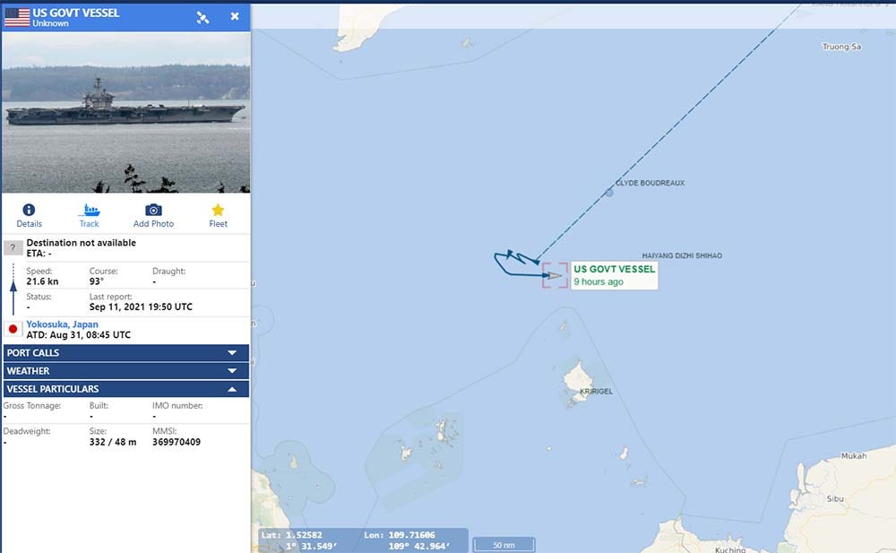 It’s remarkable that on September 11 and 12, the USS Carl Vinson carrier turned on its AIS signal and broadcasted its position in the Natuna Sea. Its position was about 50 nautical miles from Haiyang Dizhi 10.