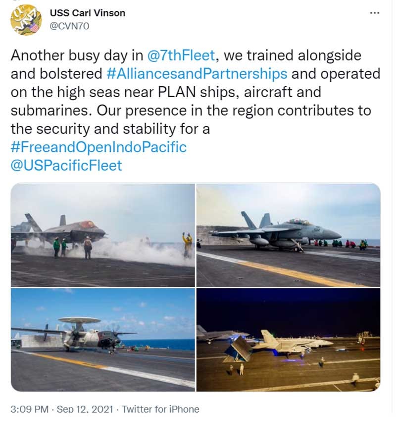 Later in the day, the official Twitter of the USS Carl Vinson carrier told us it was operating near PLAN ships, aircraft, and submarines. It was another move it rarely does.