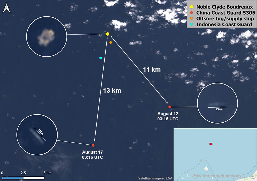 After Indonesia deployed Noble Clyde Boudreaux drilling rig to conduct an appraisal drilling campaign in Tuna Block in late June, China Coast Guard vessel 5202 was observed in the vicinity of the drilling site.